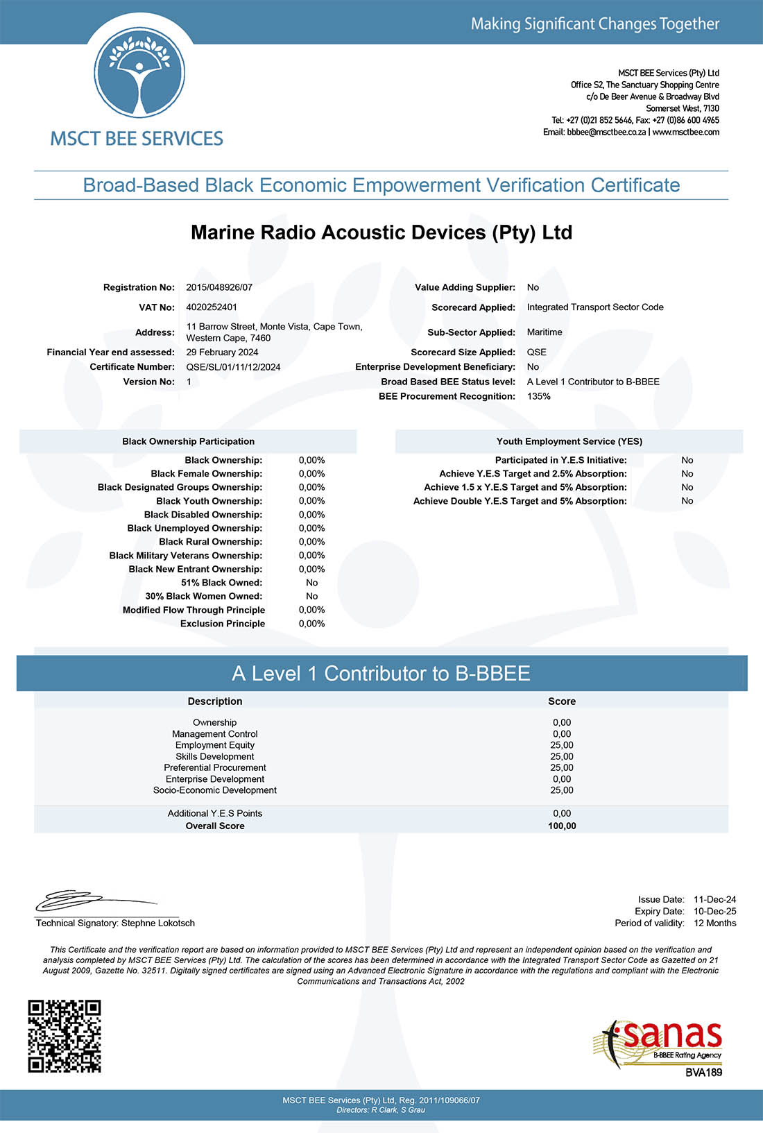 Sanas has assessed and verified the relevant B-BBEE Elements of the above-mentioned entity, to provide an independent and impartial opinion on the B-BBEE Status of the entity, based on the Transport Sector Code (32511), as well as the Broad-Based BEE Codes of Good Practice (Code 000-800).